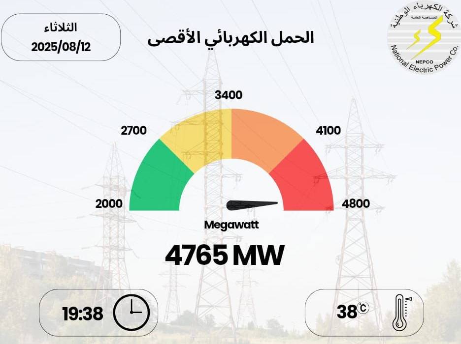 الأردن يسجل أقصى حمل كهربائي في تاريخه بواقع 4810 ميغاواط