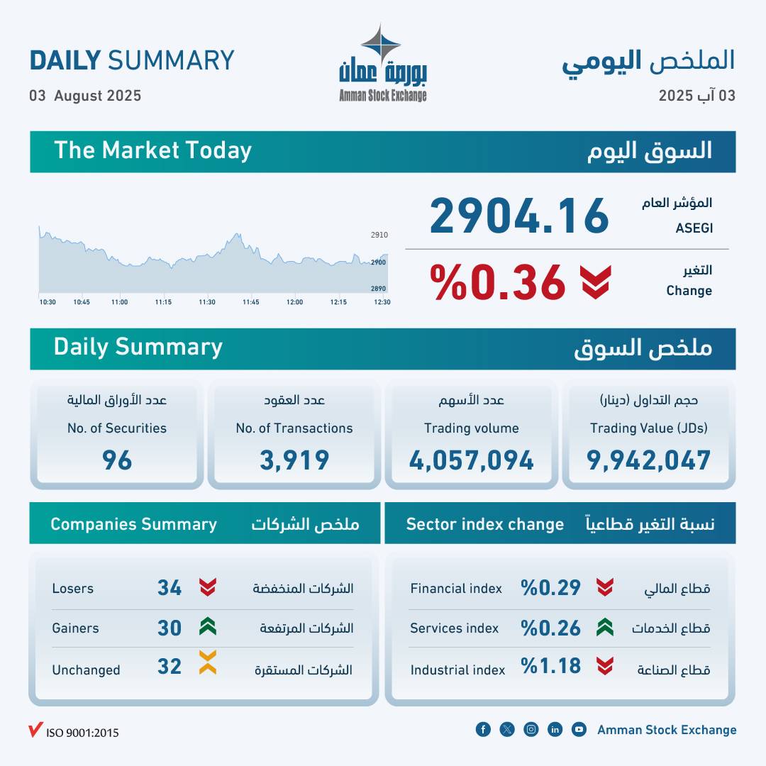 9.9 مليون دينار حجم التداول في بورصة عمان اليوم