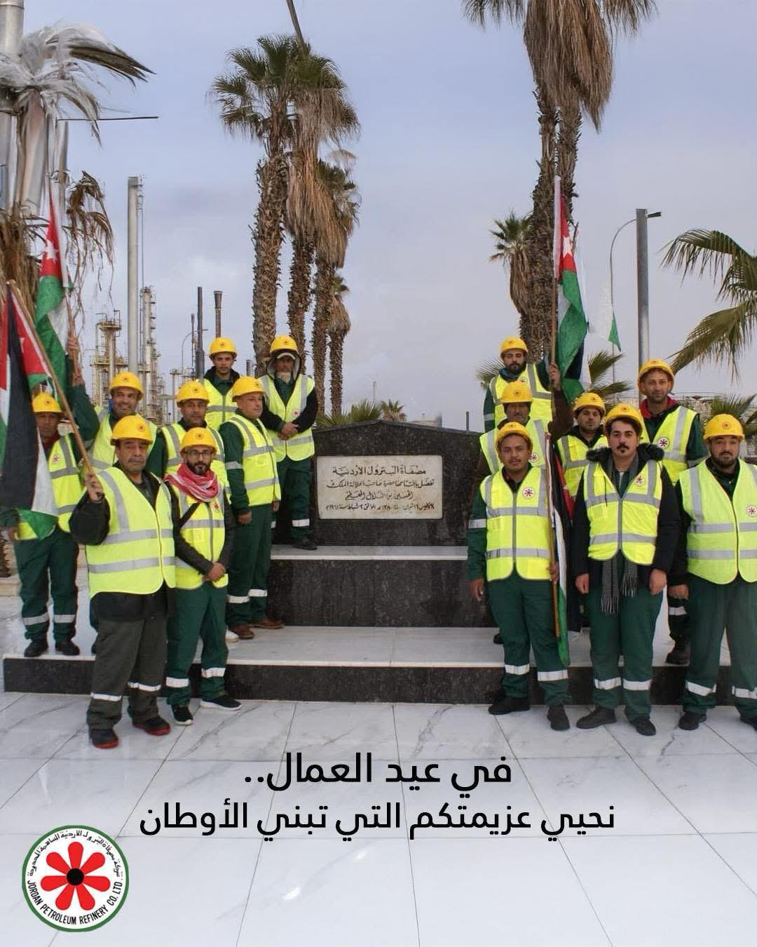 مصفاة البترول الأردنية تتوجه بتحية تقدير واعتزاز إلى كوادرها في مختلف مواقع الإنتاج والتشغيل بمناسبة عيد العمال