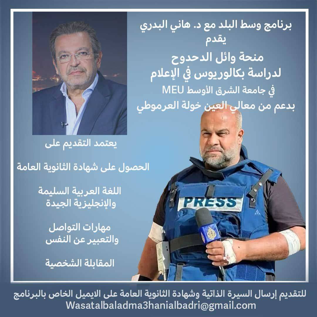 برنامج وسط البلد يعلن عن منحة دراسية بإسم الإعلامي وائل الدحدود