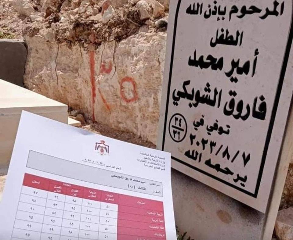 تدمي القلوب.. أردنية تبكي طفلها وتضع شهادته المدرسية على قبره