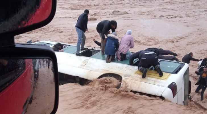 انجراف حافلة تقل طلابا في سيل مياه بمنطقة وادي موسى