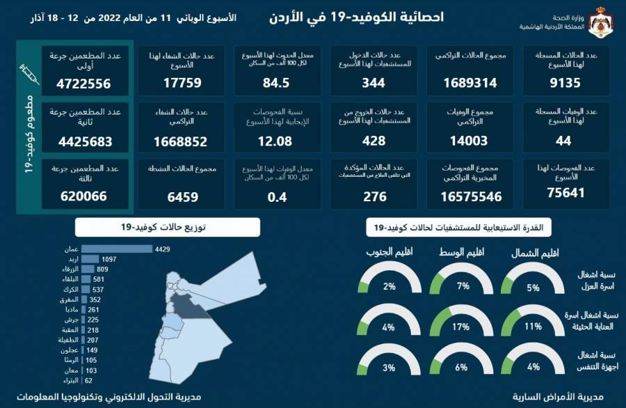 44 وفاة و9135 إصابة جديدة بكورونا في الأردن خلال أسبوع