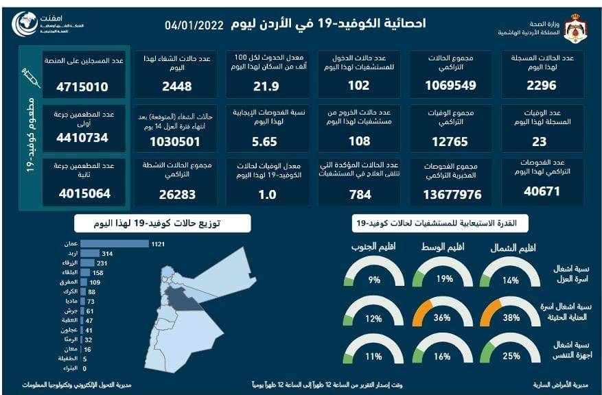 تسجيل 23 وفاة و2296 إصابة جديدة بكورونا في الأردن