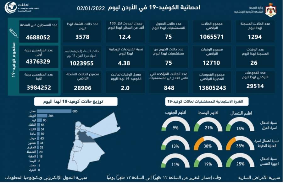 تسجيل 26 وفاة و1294 اصابة كورونا جديدة في الأردن