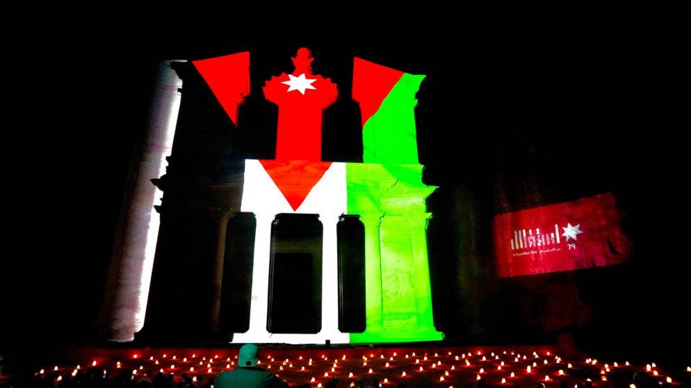 إضاءة خزنة البترا بألوان العلم الأردني احتفاء بعيد الاستقلال
