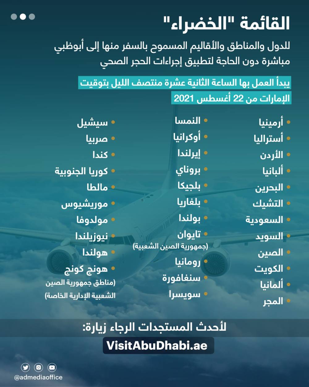 وبحسب وكالة الأنباء الإماراتية وام، يبدأ العمل بالقائمة الخضراء اعتباراً من الساعة 12 منتصف الليل بتوقيت الإمارات، الموافق 22 آب الحالي.