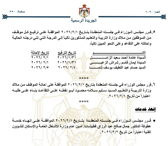 قرر مجلس الوزراء إقرار ترفيعات لموظفين في عدد من الوزارات والدوائر والمؤسسات الرسمية، إلى جانب إحالة عدد من الموظفين إلى التقاعد، وذلك ضمن قراراته الإدارية والتنظيمية.