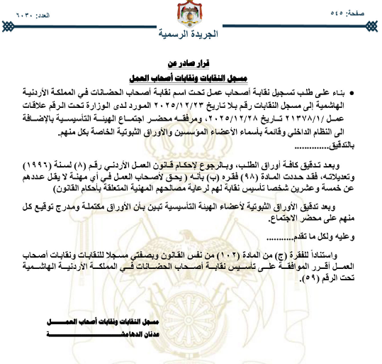 قرر مسجل النقابات ونقابات أصحاب العمل الموافقة على تأسيس نقابة أصحاب الحضانات في الأردن.