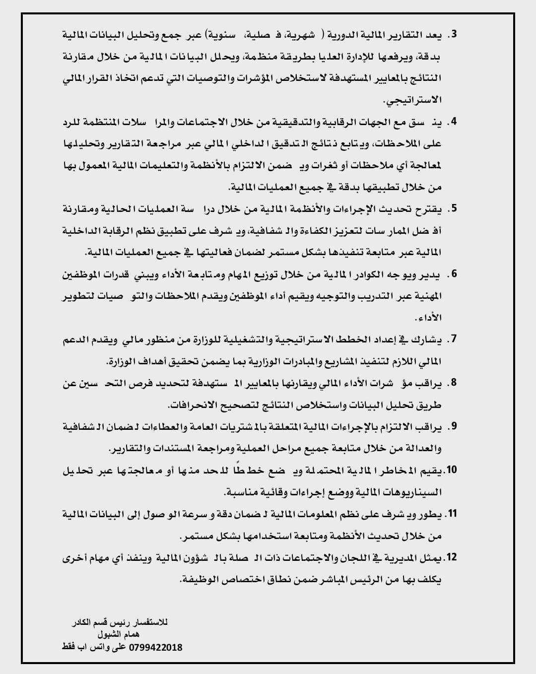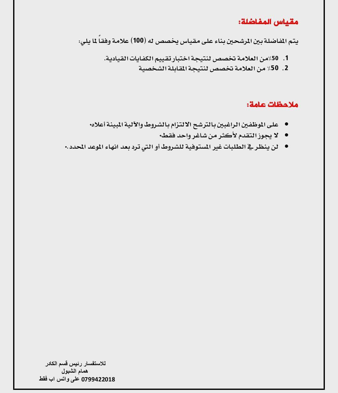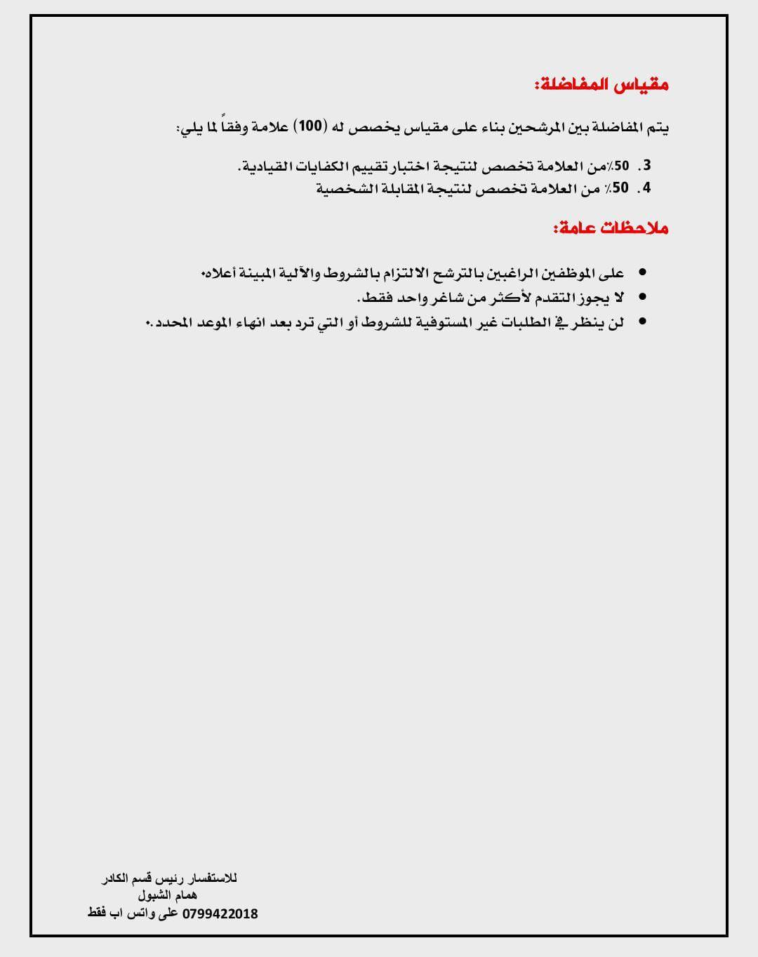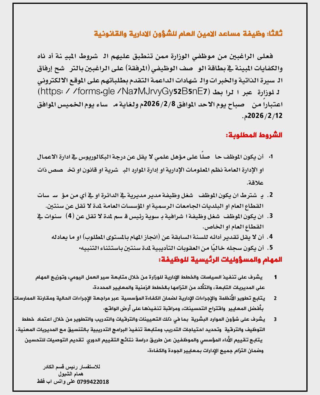 ودعت الوزارة الراغبين من موظفيها ممن تنطبق عليهم الشروط والكفايات الوظيفية المذكورة في بطاقة الوصف الوظيفي المرفقة، إلى تقديم طلباتهم عبر الموقع الالكتروني للوزارة، مرفقين بالسيرة الذاتية والخبرات والشهادات الداعمة.
